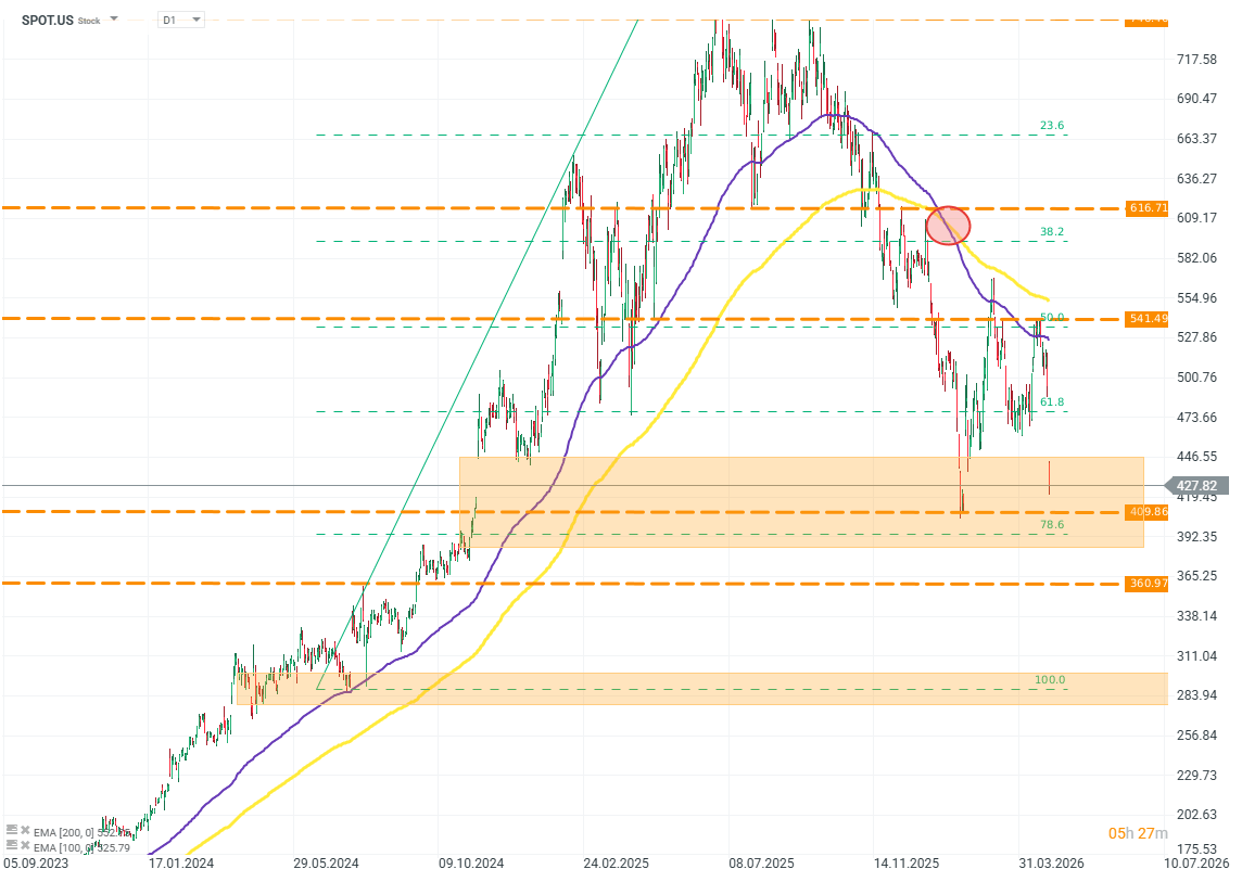 Druhá polovina roku 2025 byla pro Spotify velmi obtížná. Valuace společnosti klesla až o 45 %, čímž zcela vymazala celý růst z počátku roku 2025. Hloubka tohoto poklesu může vyvolávat otázky – otázky, které sdílejí i analytici investičních firem. Vzhledem k časovému rámci mohl být pokles valuace společnosti způsoben především rotací kapitálu do firem zaměřených na AI. Zdroj: xStation5
