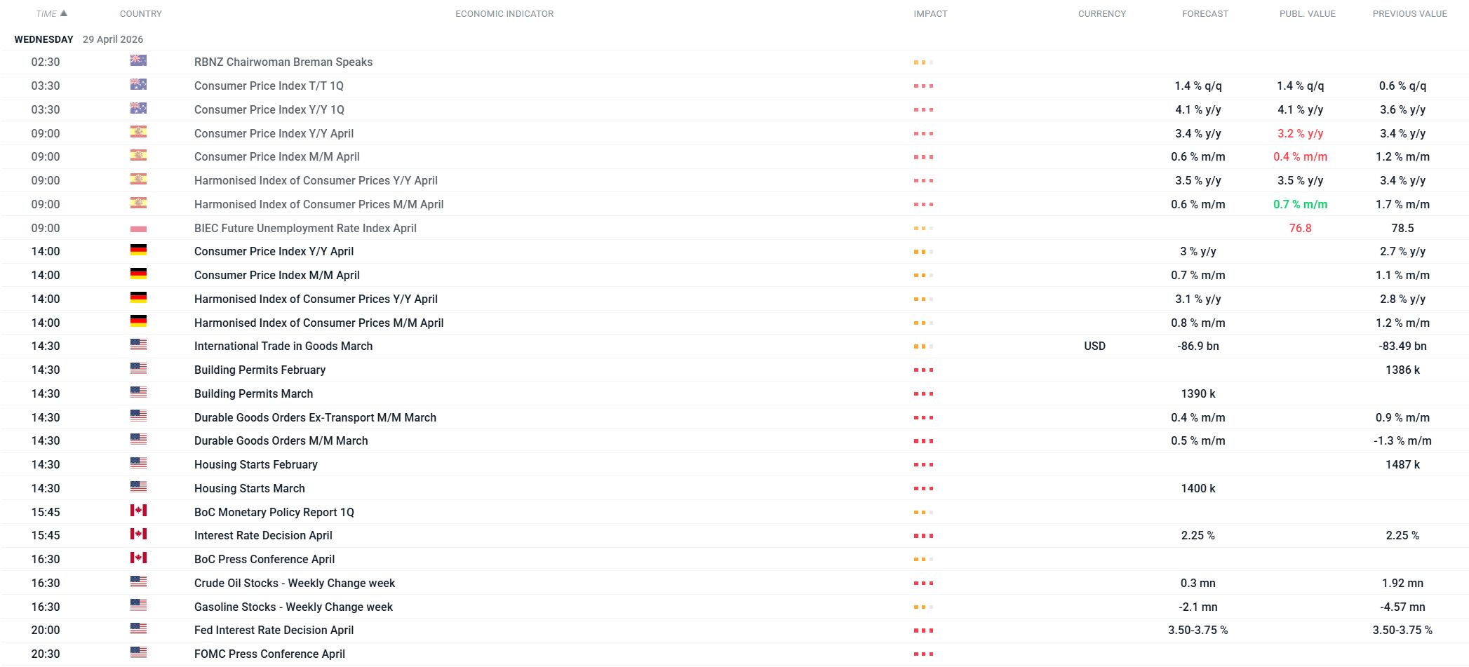 • Klíčovými událostmi dne jsou rozhodnutí Fedu o úrokových sazbách (20:00) a Bank of Canada (15:45) – v obou případech se očekává ponechání sazeb beze změny, ale tiskové konference (Powell ve 20:30, BoC v 16:30) mohou nabídnout vodítka ohledně budoucího směřování měnové politiky v prostředí zvýšené inflace tažené energiemi.