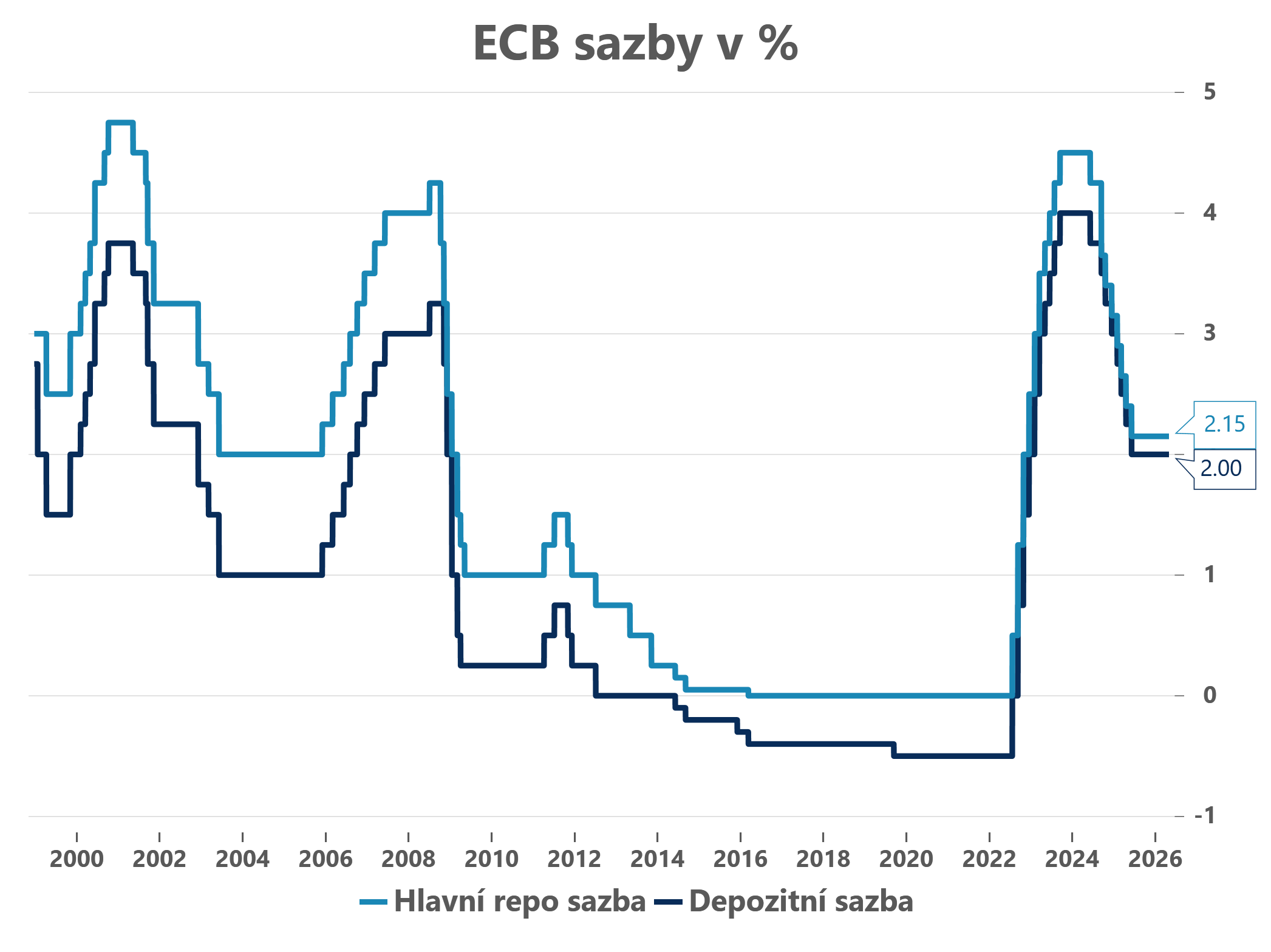 ECB na svém dnešním zasedání ponechala úrokové sazby podle očekávání beze změny, depozitní na 2 % a repo sazbu na 2,15 %. -