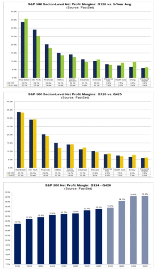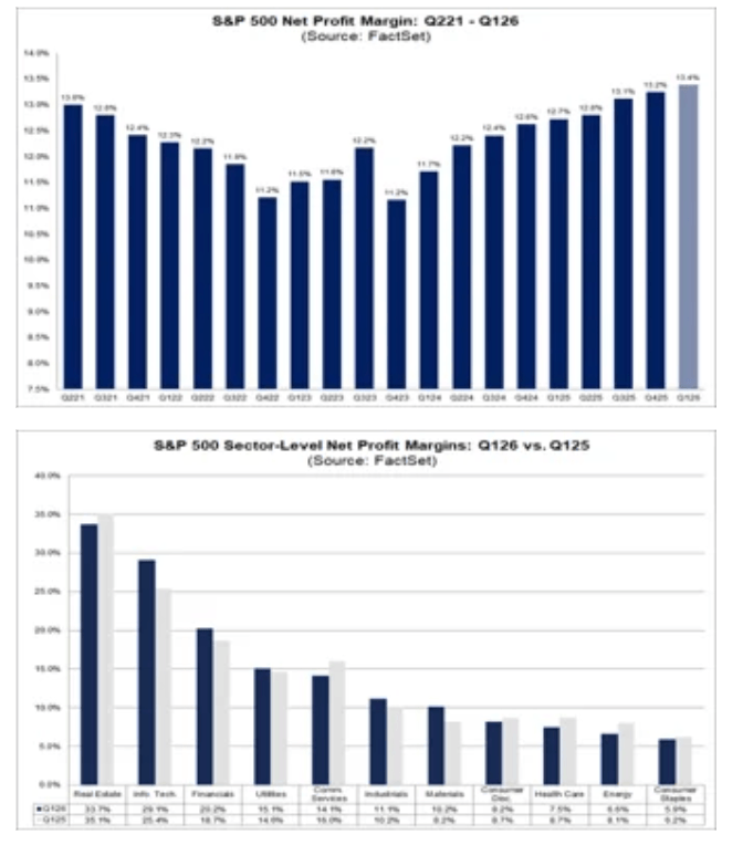 Ziskové marže společností z indexu S&P 500 zůstávají navzdory obavám z vyšších cen ropy pozoruhodně odolné. Podle dat FactSet činí kombinovaná čistá zisková marže amerických společností v 1. čtvrtletí 2026 celkem 13,4 %, což by znamenalo nejvyšší úroveň od začátku sledování v roce 2009. V současnosti 5 z 11 sektorů v indexu S&P 500 vykazuje v 1. čtvrtletí 2026 meziroční růst marží oproti 1. čtvrtletí 2025, zatímco 6 sektorů se nachází nad svým pětiletým průměrem marží.