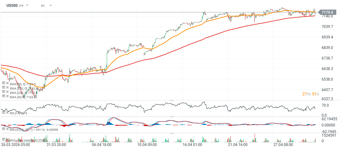 Při pohledu na graf US500 se kontrakt snaží udržet nad EMA200 na hodinovém časovém rámci, přičemž úroveň 7 140 funguje jako klíčová zóna supportu. Za zmínku stojí, že Wall Street nadále započítává další zlepšení. Konsenzuální odhady čistých marží indexu S&P 500 činí 14,1 % ve 2. čtvrtletí, 14,6 % ve 3. čtvrtletí a 14,6 % ve 4. čtvrtletí 2026. Tyto předpoklady působí relativně optimisticky vzhledem ke smíšeným signálům přicházejícím ze síly amerického spotřebitele.