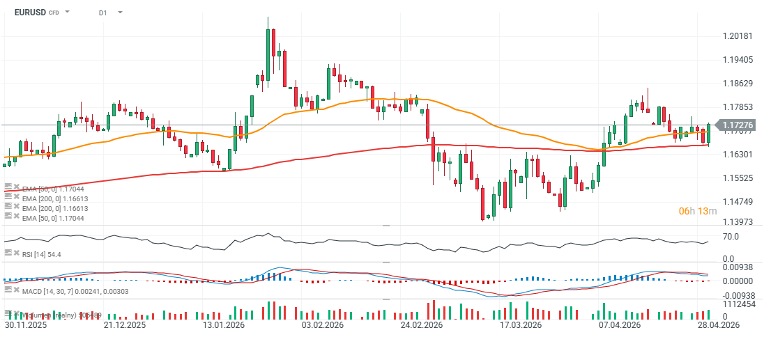 Pár EURUSD dnes roste téměř o 0,5 % a posouvá se téměř k úrovni 1,173 díky slabšímu americkému dolaru, klesajícím výnosům amerických státních dluhopisů a silnému apetitu po riziku na Wall Street. ECB na dnešním zasedání ponechala úrokové sazby beze změny a signalizovala, že cenové tlaky z energetických trhů mohou vést k růstu a destabilizaci cen energií, i kdyby konflikt s Íránem skončil. To samozřejmě přidává další nejistotu a může zpomalit evropskou ekonomiku. Banka nebude sledovat jen samotnou inflaci, ale spíše reakci trhů a spotřebitelů na ni, což činí další zvýšení úrokových sazeb v eurozóně vysoce nejistým. Dnešní americká makrodata však nebyla příliš silná.