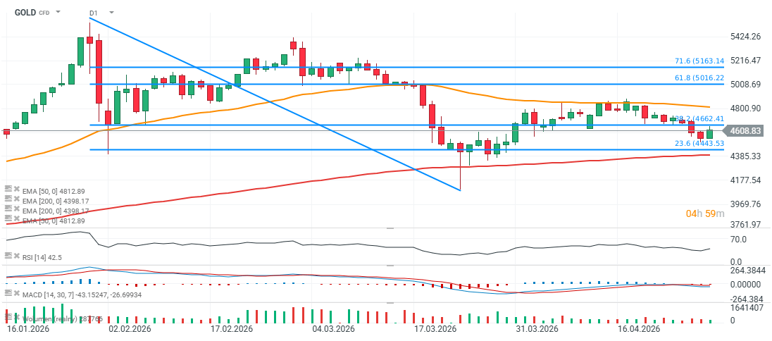 Slabší americký dolar a nižší výnosy státních dluhopisů podporují oživení cen zlata, které se snaží přerušit svou nedávnou sérii ztrát a udržitelně se vrátit nad 4 600 USD za unci. Při pohledu na Fibonacciho retracementy posledního dominantního downtrendu se oblast 4 440 USD jeví jako klíčový support, který se shoduje s 23,6% retracementem a je posílen nedávným cenovým vývojem. Na růstové straně vystupuje jako krátkodobá rezistence úroveň 4 660 USD, kde už dnes došlo k odmítnutí cen a která zároveň odpovídá 38,2% Fibonacciho retracementu. Další rezistence se nachází kolem 4 800 USD za unci, kde se aktuálně nachází EMA50 (oranžová linie).