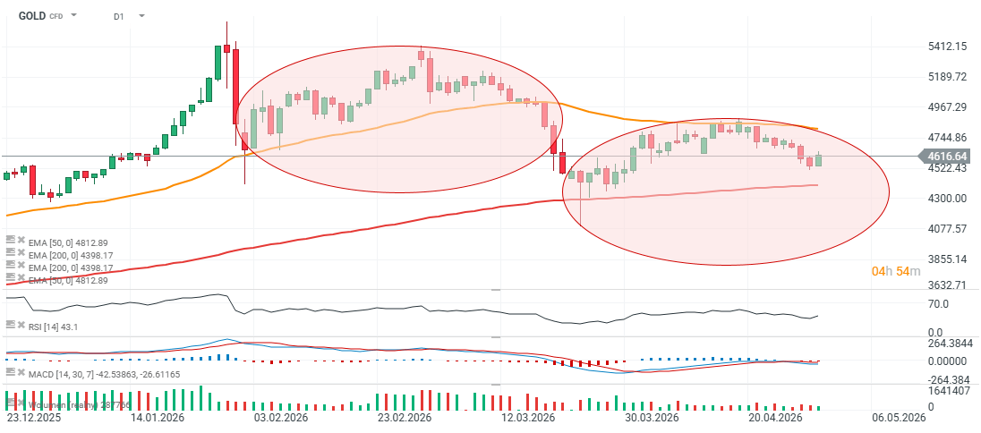 Pokud by současná fáze na trhu se zlatem kopírovala tu předchozí, mohli bychom v nadcházejících dnech očekávat růst volatility. Toto období zvýšených cenových výkyvů pravděpodobně rozhodne o tom, zda downtrend bude pokračovat, nebo se obrátí, což by potenciálně otevřelo cestu k pohybu nad 5 000 USD za unci.