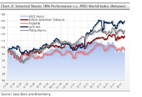 V rámci seriálu Ďábelské akcie jsme se zaměřili na úspěšné fondy, které investují do hříšných akcií. Tentokrát se podíváme na výkonnost tabákových akcií. Graf 1 a 2 ukazuje, že tabákovému průmyslu se ve srovnání se světovým akciovým trhem vede lépe. Graf 1 pak zobrazuje nepoměr výkonu Swedich Match AB ve srovnání s indexem MSCI World a tabákovým sektorem jako celku.