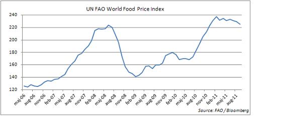 Index cen potravin United Nations Food and Agriculture Food Price Index zahrnuje 55 komodit a v září dosahoval 225 bodů, proti srpnu poklesl o 2%, proti únorovému maximu o 5,5%. Je však stále výše než v září 2010, kdy jeho hodnota byla 195 bodů. Pokles vedl cukr (-3,8%) obiloviny (-3,0%) a oleje (-2,3%).