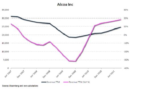 Začněme tím, co bylo na výsledcích nejpozitivnější, konkrétně růst obratu. 12 měsíční obrat se proti loňskému roku zvýšil o 20 procent a tempo růstu dokonce zrychluje. To znamená, že ekonomika stále expanduje, což ve svém prohlášení uvedl i management společnosti Alcoa (jen v Evropě je situace slabší).