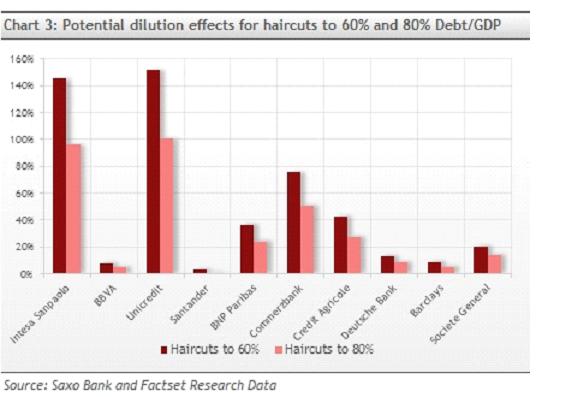 Snížení hodnoty podle scénářů výše by nevyhnutelně vedlo k rozsáhlým ztrátám bank k Itálii, Francii a Německu, a také by se tím potvrdily obavy z šíření krize z okrajových zemí na další země (viz graf 1 a 2).