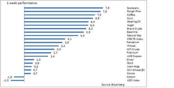 Index Reuters Jeffries CRB za minulý týden přidal čtyři procenta a od říjnových minim přidal za dva týdny 8,5 procent. Část těchto zisků lze vysvětlit oslabením dolaru za tu samou dobu o zhruba 4 procenta. Zemědělský sektor, který měl překvapivě dlouhou expozici, v uplynulých měsících prošel dramatickou redukcí. Nyní se obchodníci vraceli a znovu otevírali dlouhé pozice, především na kukuřici, sojových bobech a rýži.
