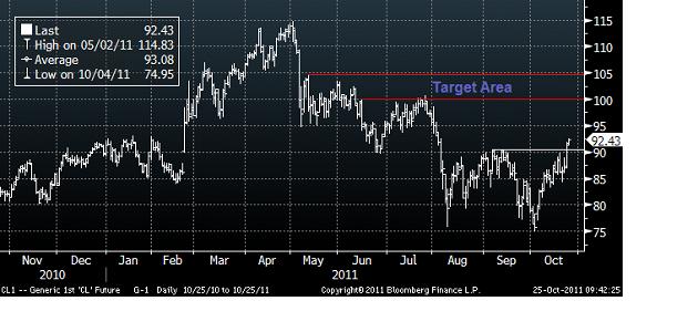 Technicky přešla ropa WTI po té, co v pondělí překonala hranici 91 dolarů, z negativní formace do formace neutrální. Většina toho růstu byla pravděpodobně způsobena zavíráním krátkých pozic (spekulací na pokles), protože investoři byly nuceni díky menší pravděpodobnosti recese přehodnotit rizika. Pokud se ve středu nedočkáme po meetingu kvůli evropské dluhové krizi negativních zpráv, může ropa v následujících týdnech šplhat až k hranici 100 až 105 dolarů.