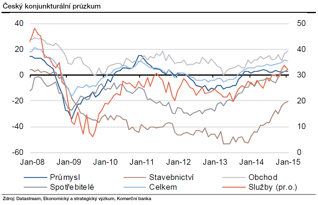 Od poloviny ledna se ovšem situace začala měnit a o měsíc později je na finančních trzích patrná pozitivní změna nálady. Kurz eura se zastabilizoval a zrovna tak hodnota české koruny. Akciové indexy atakují v posledních dnech maxima, dokonce roste i index pražské burzy. A co je podstatnější, zvyšovat se začíná i ekonomický sentiment. Za zmínku stojí bezesporu německé ZEW či IFO indexy monitorující očekávání investorů respektive firem. Již za závěrečné čtvrtletí loňského roku zaznamenala německá ekonomika nečekaně silné zotavení a pozitivní faktory v podobě nízkých cen ropy, slabého eura a extrémně nízkých úrokových sazeb jsou příslibem, že si Německo tento růst udrží i minimálně v tomto čtvrtletí. A to je dobrá zpráva nejenom pro eurozónu, ale i pro středoevropské ekonomiky včetně té české a jejich finanční trhy.
