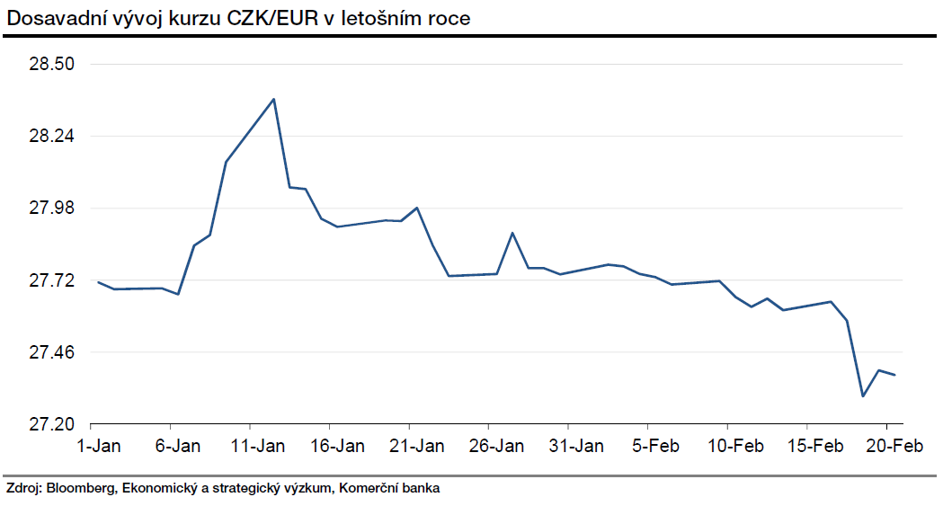 Dosavadní letošní vývoj kurzu české koruny vůči euru se vůbec nedá srovnávat s tím loňským. Zatímco pro rok 2014 byla charakteristická stabilita měnového kurzu, letošní kurzový vývoj je naopak ve znamení vysoké volatility. Během první poloviny ledna koruna ztrácela na šestileté minimum, když se kurz dostal na dosah úrovně 28,50 CZK/EUR. O zhruba měsíc později již česká měna naopak atakovala svou nejsilnější hodnotu od poloviny listopadu 2013. Včera ráno se kurz dostal až téměř k 27,20 CZK/EUR. Měna reagovala na středeční slova prezidenta Zemana.