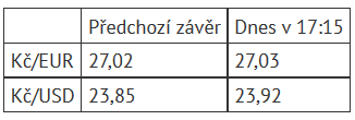 Česká měna dnes stagnovala k euru a oslabila vůči dolaru. Koruna k 17:15 sice oproti předchozímu závěru ztrácela i k euru, ale pouze o jeden haléř na 27,03 Kč/EUR. Vůči dolaru oslabila o sedm haléřů na 23,92 Kč/USD. Vyplývá to z údajů na serveru Patria Online.