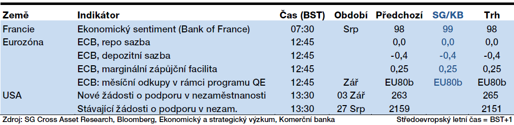 Holubičí zasedání ECB se mezi investory očekává. Výraznější pohyby by proto mělo přinést jen případné překvapení, hlavně pokud se evropští centrální bankéři pro žádnou změnu měnové politiky nerozhodnou. Koruna by měla zůstat u hranice kurzového závazku. Zveřejnění srpnového podílu nezaměstnaných na trh nebude mít vliv.