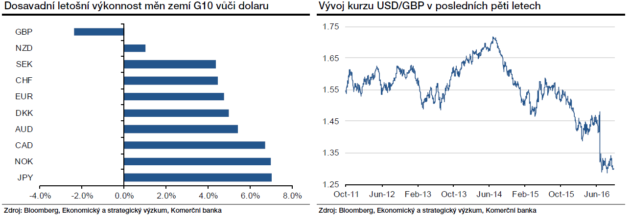 Jedinou významnější měnou, které se letos nepodařilo proti dolaru zhodnotit, je britská libra, která doplatila na výsledek červnového referenda ohledně setrvání Velké Británie v Evropské unii. V bezprostřední reakci na brexit spadla její hodnota na nejnižší hodnotu za poslední tři dekády. I přes stabilizaci v průběhu prázdninových měsíců nakonec vykáže libra vůči dolaru za třetí čtvrtletí pokles, a to už pátý v řadě. Tak dlouhý sestupný trend na libře nebyl od roku 1984.