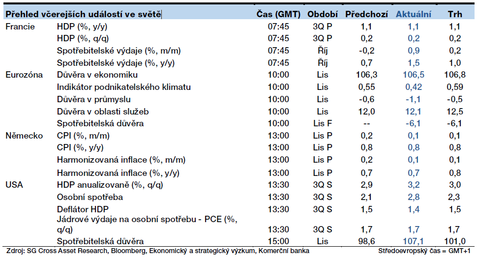HDP ve Francii včera dostálo očekávání trhu, když ve třetím čtvrtletí přidalo 0,2 % q/q, což v meziročním vyjádření představovalo 1,1 %. Překvapivě vzrostly spotřebitelské výdaje v říjnu o 0,9 % m/m. Meziroční tempo pak bylo na úrovni 1,5 % y/y.