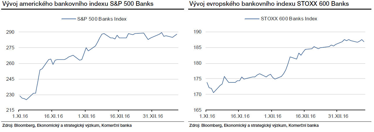 Neočekávané zvolení Donalda Trumpa americkým prezidentem přineslo zásadní impulz do vývoje bankovního sektoru. Plán na posílení fiskálních stimulů, snížení daní a uvolnění regulace zapůsobil jako živá voda na akcie bankovních domů jak v Americe, tak v Evropě. V prosinci pak rozhodnutí Fedu o zvýšení úrokových sazeb spolu, s oznámením dalších tří očekávaných zvýšení během letošního roku dále posílilo důvěru investorů v bankovní sektor. Americký index S&P 500 Banks si tak od listopadových voleb v USA připsal výrazných 25 %. Evropské bankovní tituly nezůstaly stranou a také se připojily k povolební euforii. Evropský STOXX Banks index si od začátku listopadu připsal necelých 15 %, podpořen částečným snížením odkupů aktiv ECB, zlepšujícími se vyhlídkami hospodářského vývoje v eurozóně a počínajícím růstem inflace.
