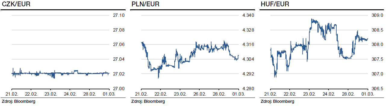 Kurz koruny zůstal stejně jako v minulých dnech beze změny na úrovni 27,02 CZK/EUR. Necelé 0,1 % ztratil polský zlotý, když oslabil na 4,32 PLN/EUR. Maďarský forint spadl o 0,3 % na 308,4 HUF/EUR.