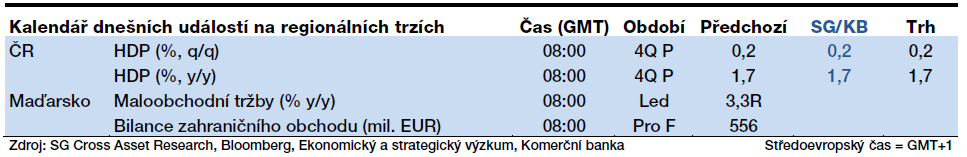 Údaje o HDP by měly v eurozóně potvrdit příznivý konec loňského roku. Velmi dobré číslo očekáváme i z české ekonomiky, což by mohlo přinést další tlak na kurzový závazek ČNB. -