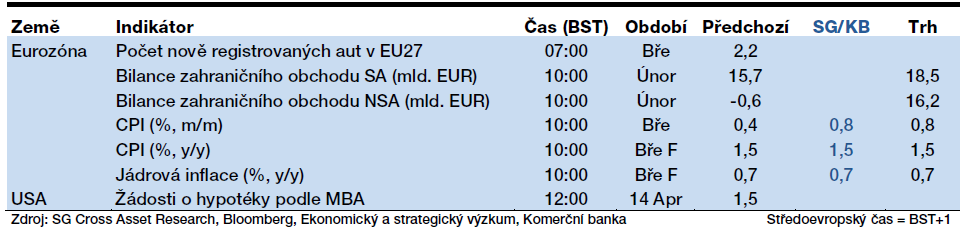 Průmyslová produkce v ČR za únor ukáže na slabou výrobu aut v důsledku nedostatku komponent. Mírný pokles by podle nás měly zaznamenat i tovární objednávky v Německu za stejný měsíc. Únorové ceny průmyslových výrobců potvrdí sílu inflačních tlaků v eurozóně, což bude důležitá informace i pro ČNB. Zvýšené cenové tlaky sehrají hlavní roli i v dnes zveřejněném rozhodnutí polské centrální banky, která patrně zvýší klíčovou úrokovou sazbu o dalších 50 bb na 4 %. Zápis z posledního zasedání americké centrální banky potom naznačí, jakým způsobem bude Fed snižovat svoji obří bilanční sumu. -