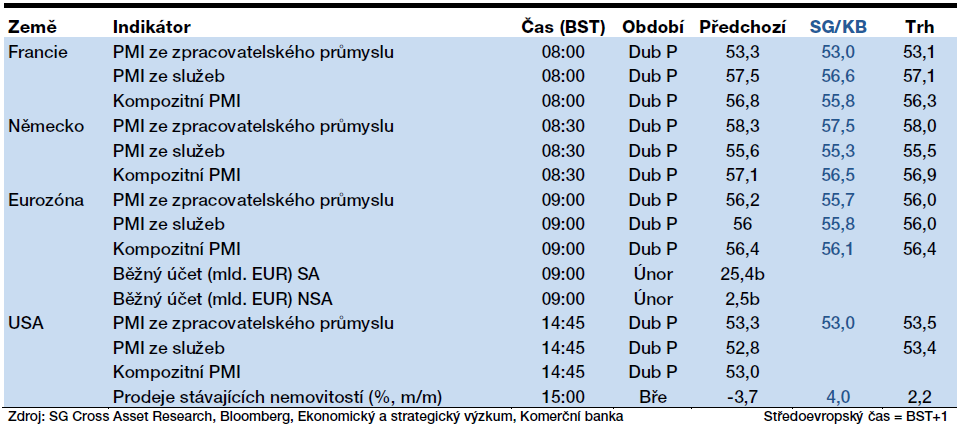 Vstup evropské ekonomiky do nového roku byl velmi úspěšný, když aktivita v sektorech průmyslu i služeb rychle rosta. S druhým čtvrtletím již ale očekáváme, že PMI ze svých vysokých hodnot začnou mírně ustupovat. Za mírným snížením dubnového kompozitního PMI za celou eurozónu vidíme nižší hodnoty indexů ve francouzském sektoru služeb a v německém průmyslu. I tak by ale celkové dubnové PMI bylo konzistentní s anualizovaným růstem eurozóny o 3 %.