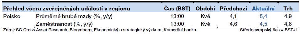 Dnes zveřejněný zápis ze zasedání ECB by měl odpovídat velmi holubičímu tónu tiskové konference M. Draghiho po posledním zasedání rady guvernérů. Neměli bychom se také dozvědět mnoho o omezování programu nákupu aktiv. O něm by mělo být rozhodnuto až po zářijové prognóze. Data z polského trhu práce ukáží na dočasné mírné zpomalení tempa jejich růstu. -