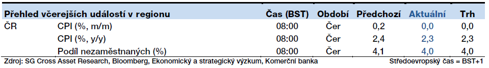 Po údajích o vývoji spotřebitelské inflace v jednotlivých ekonomikách eurozóny publikovaných minulý týden bude dnes zveřejněn i první odhad za eurozónu jako celek. Ten by podle odhadu ekonomů SG měl stagnovat na úrovni 1,3 % y/y. Volatilní složky potravin a cen energií by se v červenci mohly mírně zvýšit, protože pozitivní efekty statistické základy budou vykompenzovány nižší cenou ropy. Dokonce roku by tempo spotřebitelských cen mělo zůstat na úrovni 1,3 % y/y v důsledku nižších cen ropy a nižšího odhadu jejího dalšího vývoje. -