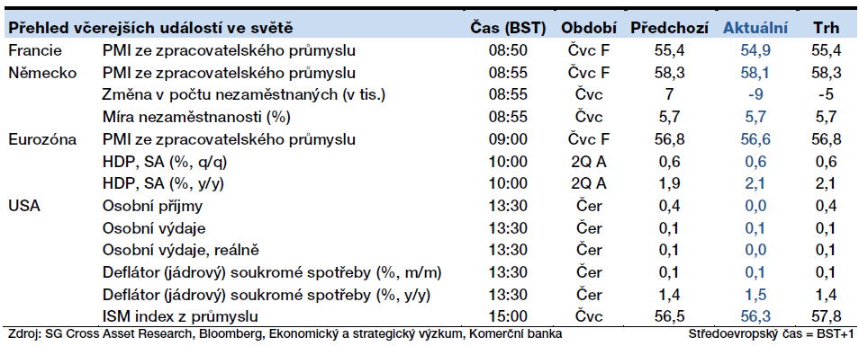 Hlavní událostí dnešního dne bude zasedání americké centrální banky. Ta sice ponechá úrokové sazby beze změny, mohla by však oznámit své plány ohledně snižování bilanční sumy. Náš hlavní scénář však počítá s tím, že k tomuto kroku přistoupí až v září. Ve stínu zasedání Fedu dnes zveřejněná data zřejmě zaniknou. Bude mezi ně patřit prodej nových domů ve Spojených státech a francouzská červencová spotřebitelská důvěra. Ta by se měla udržet na vysokých hodnotách z minulého měsíce. -