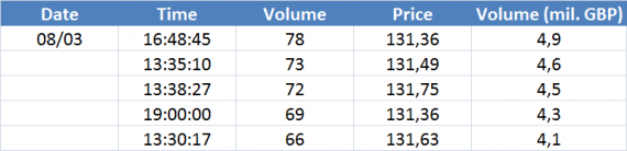 Největší obchody podle objemu na GBPUSD future Jul17:
