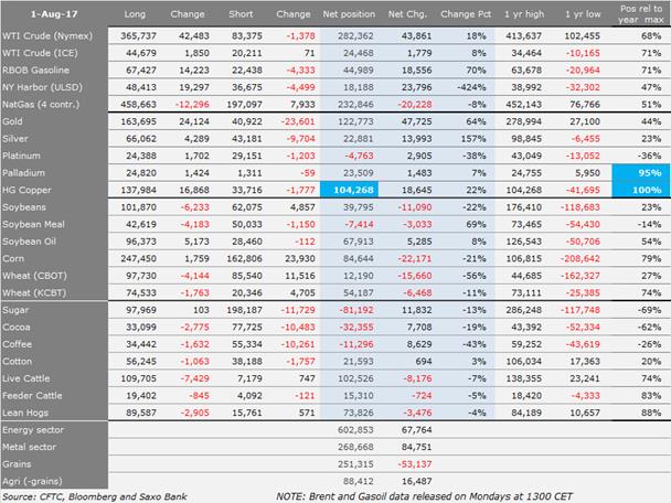 Plodiny zažily po prudkém oživení z počátku července prudký obrat a index obilí Bloomberg Commodity Grain přišel o všechen zisk. Fondy tedy zůstaly s nechtěnými dlouhými pozicemi po třech týdnech změn v sektoru pšenice, kukuřice a sojových bobů, kdy se expozice zvýšila ze 44 000 v krátkých čistých pozicích na 246 000 dlouhých čistých pozic. Díky tomu se tyto tři hlavní plodiny prodávaly i přes trvalou podporu vzhledem k pokračujícímu suchu a slabému USD.