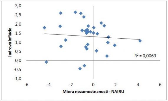 Podľa teórie by medzi týmito dvoma časovými radmi mala byť výraznejšia korelácia, v praxi je však len minimálna. To isté platí aj keď sa pozrieme do sveta, pre krajiny OECD som spravil korelačný graf, v ktorom by mala byť podľa teórie trendová čiara klesajúca. A ona klesá len štatisticky zanedbateľne. Koeficient determinácie hovorí, že vývoj jadrovej inflácie vysvetľuje rozdiel medzi nezamestnanosťou a NAIRU len z 0,63%, čo je de facto nulový vzťah.