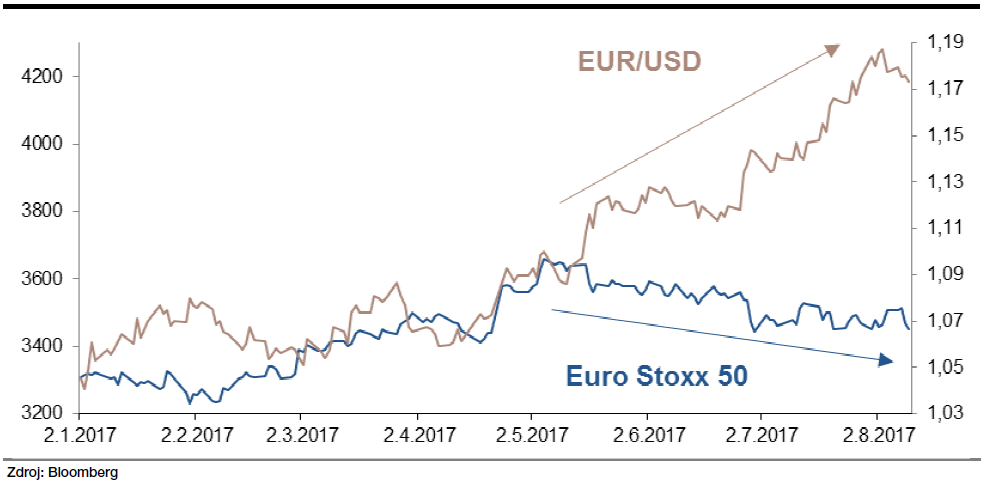 Kurz eura vůči americkému dolaru od začátku letošního roku posílil z 1,05 na 1,17. Klasická poučka o oslabujících akciových trzích při posilující domácí měně však pro evropské akcie na začátku letošního roku neplatila. Především díky dobrým firemním výsledkům a sílícímu hospodářskému růstu v eurozóně evropské akcie až do poloviny května posilovaly a index padesáti největších evropských firem Euro Stoxx 50 si připsal více než 11 %. Od poloviny května však již pokračující posilování eura začalo být evropským akciím přítěží a index Euro Stoxx 50 odevzdal skoro polovinu svých předchozích zisků. Kterým akciím nebo sektorům se tedy při tomto trendu vyhnout a naopak kde hledat jistotu nebo růst? Nejvíce byli posilujícím eurem postiženi exportéři, a to především ti s vysokým vývozem do USA. Z velkých evropských společností, jejichž akcie se obchodují na burze, pak nejvíce ztrácely farmaceutické firmy, následované výrobci spotřebního zboží. Podíl jejich prodejů v eurozóně nepřesahoval jednu čtvrtinu celkových tržeb a vývoz do USA přesahoval 50 %. Pro ochranu portfolia před posilujícím kurzem eura se tedy jeví vhodnější volit společnosti zaměřené na evropský trh. Lépe se také v čase posilující evropské měny dařilo menším společnostem, které lépe odolávaly tlaku posilující evropské měny.