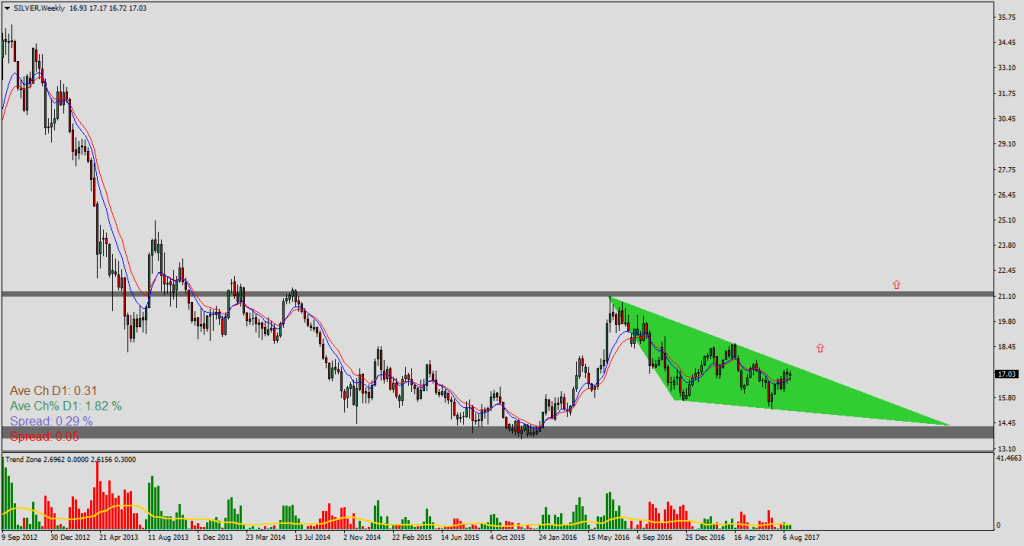 Cena stříbra se aktuálně pohybuje v rámci formace trojúhelníku. Krátce ještě může pokračovat klesající trend. Pak ale předpokládáme průchod horní stranou trojúhelníku a následně otočení k růstovému trendu.