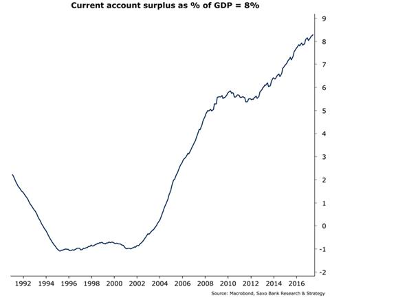 Politici chválí masivní přebytek běžného účtu dosahujícího 8 % HDP coby ukazatel vysoké konkurenceschopnosti, avšak je to i známka toho, že místní firmy nechtějí doma investovat. Podobný ač méně výrazný trend můžeme pozorovat také v severských zemích.