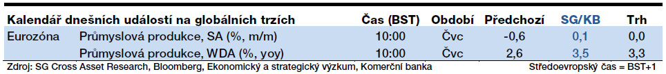 Červencová průmyslová výroba za eurozónu jako celek by si měla alespoň nepatrně polepšit. Po červnovém propadu o 0,6 % meziměsíčně si podle ekonomů SG na své konto připíše růst alespoň o jednu desetinu. Pozornost trhů se dnes bude upínat také na projev prezidenta Evropské komise J. C. Junckera. Kromě zhodnocení stavu unie by se měl Juncker zaměřit na její budoucnost a představit mimo jiné, jak by EU mohla vypadat po brexitu.