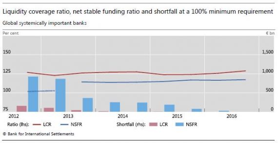 Globálne systemicky dôležité banky už naplnili požiadavky na krytie likvidity (likvidné aktíva musia presahovať plánované odtoky cash-flowu) a s veľkou pravdepodobnosťou aj požiadavky na stabilné financovanie (stabilné zdroje financovania, čo sú dlhodobé úvery, vklady a akciový kapitál, musia byť vyššie ako hodnota stanovená regulátorom pre danú banku na základe štruktúry aktív), keďže v roku 2016 už bol tento cieľ takmer naplnený. Otázka je, či sú teraz banky bezpečnejšie? S veľkou pravdepodobnosťou sú menej citlivé na zatvorenie kohútikov krátkodobého financovania, môžu sa však objaviť iné výzvy, s ktorými regulátori nepočítali (@BIS_org):