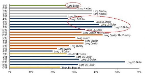 Tvorcovia ankety z Bank of America zaradili v septembri do rebríčka najprekúpenejších aktív aj Bitcoin, a ten sa hneď zaradil na prvé miesto, kde vystriedal long na americký technologický index Nasdaq. Na treťom mieste je short na americký dolár (ešte prednedávnom pritom viedol tento rebríček long na USD):