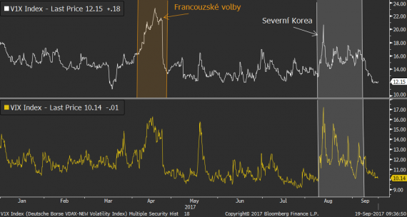 Odpověď není složitá. Ve skutečnosti se nic nemění a vše se jen navrací zpět do letošního „normálu“. Pohled na implikovanou volatilitu S&P500 a DAXu je v tomto ohledu docela výmluvný. Obě volatility si totiž v září prošly výrazným kolapsem a po nervózním srpnu se vrací zpět na samotné dno.