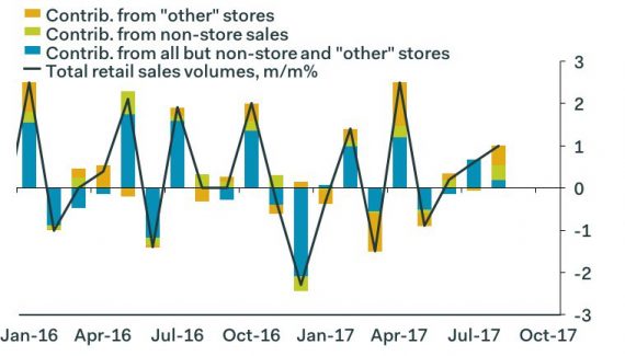 2. Rast bol ťahaný najvolatilnejším komponentom – tržbami v iných obchodoch. Keď sa pozrieme na graf od začiatku roka 2016, v ktorom je táto položka oranžovou, tak okrem jednej výnimky vždy po pozitívnom príspevku k maloobchodným tržbách nasledoval negatívny. Čiže je veľká pravdepodobnosť, že v budúcom mesiaci bude jeho príspevok negatívny a pokojne môže dostať medzimesačnú zmenu do mínusu.
