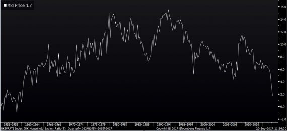 3. Toto všetko sa deje v situácii, kedy britské domácnosti prestávajú šetriť. V prvom kvartáli dosiahla miera úspor 1,7%, čo predstavuje najnižšiu úroveň od začiatku 60-tych rokov. Miera úspor začala prudko klesať po referende o BrExite.