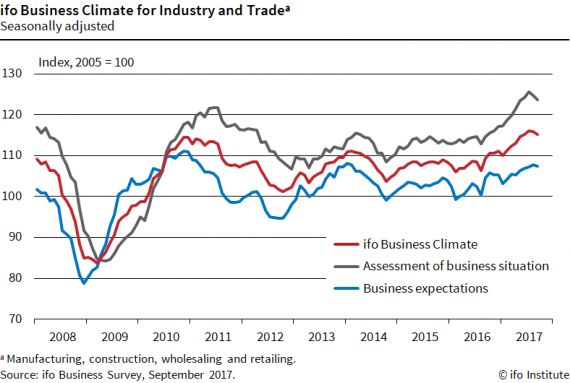 Z fundamentů dnes zatím zaujala pouze data z Německa, které zveřejnilo zářijový index IFO. Ten tentokrát mírně zklamal pádem ba 115,2b., zatímco trh doufal v růst na 116b. IFO ale dál zůstává na dosah historických rekordů, takže se na celkovém optimismu ohledně vývoje německé ekonomiky po dnešku rozhodně nic nemění.