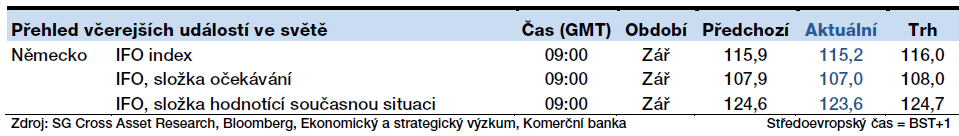 Dobré zprávy pro investory v eurozóně nepřinesl ani německý Ifo index. Ten v září zaostal za očekáváním trhu a oproti srpnu překvapivě (mírně) poklesl. Důvěra podnikatelů v německou ekonomiku se sice stále nachází poblíž rekordně dobrých úrovní, její pokles (druhý v řadě) však naznačuje, že zrychlování růstu v Německu už dosahuje vrcholu.