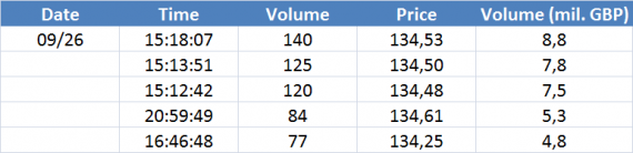 Největší obchody podle objemu na GBPUSD future Sep17: