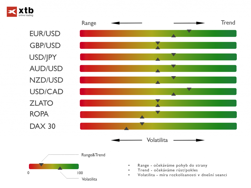XTB Market barometr vyjadřuje náš náhled na momentální sentiment a na to, v jakém duchu by se během dnešní seance mohlo nést obchodování na jednotlivých finančních aktivech. Pro každé aktivum se přitom zaměřujeme na jeho trendovost a netrendovost (range/chop) a na volatilitu. Možných scénářů a kombinací obou indikátorů je řada, ale níže nabízíme pro větší přehlednost pár extrémních scénářů, které by měly pomoci k lepší identifikaci toho, co indikátory range/trend a volatility symbolizují.