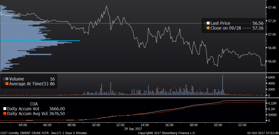 Důležité úrovně podle celkového volume na jednotlivých cenách (Brent future Dec17 8:00 – 22:00)