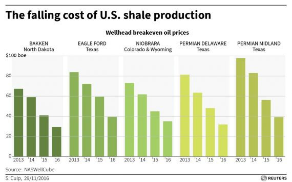A tie klesajú. Vzhľadom na to, že sa jedná o novú technológiu, tak je priestor pre jej zdokonaľovanie vysoký. Nízke ceny ropy prinútili bridlicových producentov tento proces urýchlili a priemerné náklady na ťažbu klesli od roku 2013 do roku 2016 z viac ako 60 pod 40 dolárov za barel. Keď k tomu pripočítame fixné náklady a maržu, tak aktuálne sa oplatí ťažiť bridlicovú ropu pri cene povedzme 45-50 dolárov za barel.