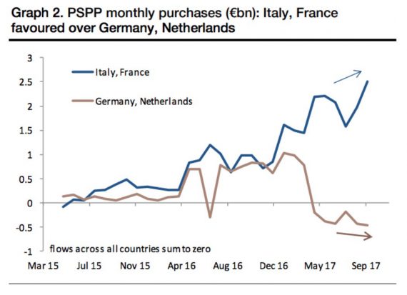 Divergnecia v nákupoch ECB – v posledných mesiacoch nakupuje ECB v pomere ku kapitálovému kľúču viac dlhopisov Talianska a Francúzska a menej dlhopisov Nemecka a Holandska. Zrejme to bude preto, že sa vyčerpávajú dlhopisy týchto krajín prípustné pre nákupy. Každopádne ECB pomáha Francúzsku a Taliansku najviac od spustenia QE. To sa niektorým ľuďom v Nemecku (a v SaS