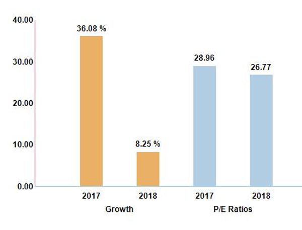 Investoři vždy hledají společnosti s dobrými vyhlídkami na růst, které se prodávají za atraktivní ceny. Jednou z populárních statistik, která byla použita k identifikaci takových akcií, je poměr PEG – což je prostě poměr cen zisků vydělený tempem růstu. V tomto případě používáme prognózu růstu (založenou na konsensu profesionálních analytiků) a předpokládané příjmy v příštích 12 měsících. Teoreticky platí, že čím je poměr PEG nižší, tím lepší je; platíte méně za budoucí růst výdělku. Poměr PEG pro tuto společnost vychází z očekávaného zisku za dvanáct měsíců končící zářím 2018.