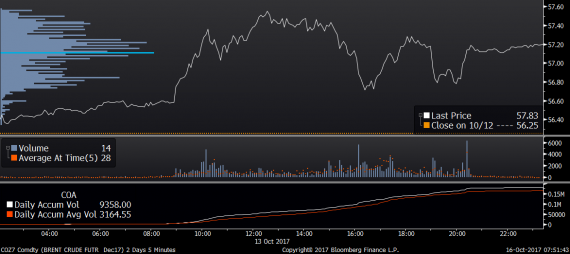 Důležité úrovně podle celkového volume na jednotlivých cenách (Brent future Dec17 8:00 – 22:00)