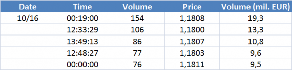 Největší obchody podle objemu na GBPUSD future Oct17: